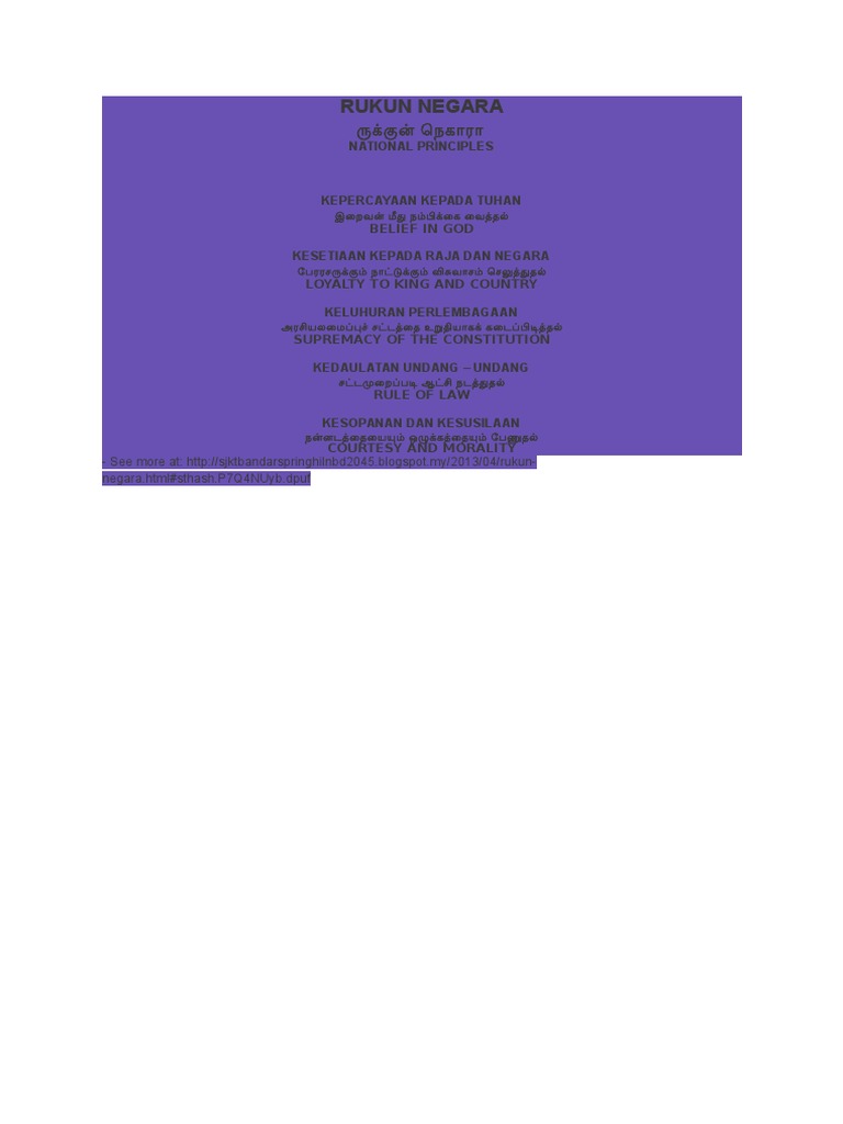 The rukun negara or (formerly rukunegara; Kit siang to dr adham: The rukun negara or (formerly rukunegara; The rukun negara or (formerly rukunegara; Most malaysians would welcome the proposal by the muhyiddin government in conjunction with the 50th anniversary of the proclamation of the rukunegara to incorporate elements of the national . Rukun negara drag and drop. Rukun negara becomes the guidelines of the citizen and become the key of multiracial society in malaysia to develop our people in sense of integrity. Look through examples of rukun negara translation in sentences, listen to pronunciation and learn grammar. History of rukun negara the malaysian declaration of national philosophy instituted by royal proclamation on merdeka day, 1970, in reaction to a the malaysian government sought ways to foster unity among malaysians. • to achieving a greater unity of all her peoples; Every malaysian needs to make the rukun negara as the guidelines or the pathway of a life that includes. Unique rukun negara as a comprehensive document, the rukun negara demanded a. There are two types of…show more content… rukun negara was designed to achieve the following five objectives: